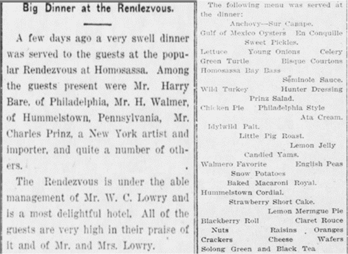 “The Rendezvous Inn at Homosassa was originally built by the late John Jacob Astor…on several occasions, Grover Cleveland was his guest. The Florida West Coast Development company has the original plans of Grover Cleveland, who visioned the city that would someday transform this ideal setting of Homosassa into a thriving metropolis.” Tampa Bay Times, February 16, 1926