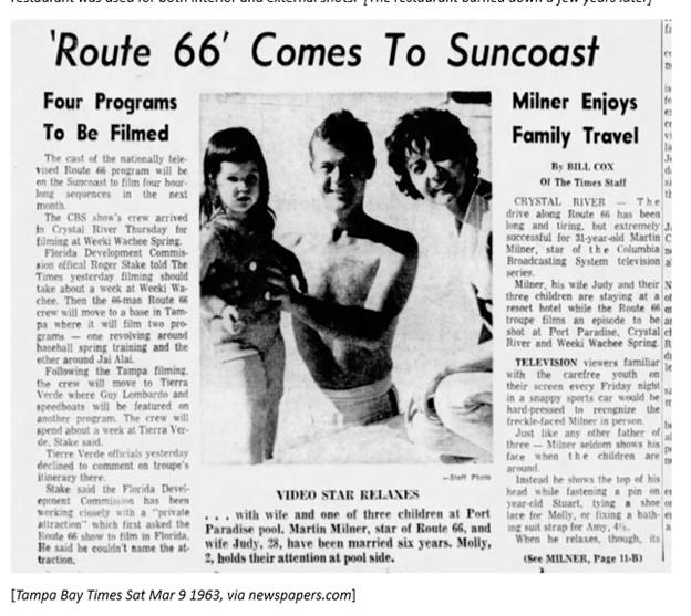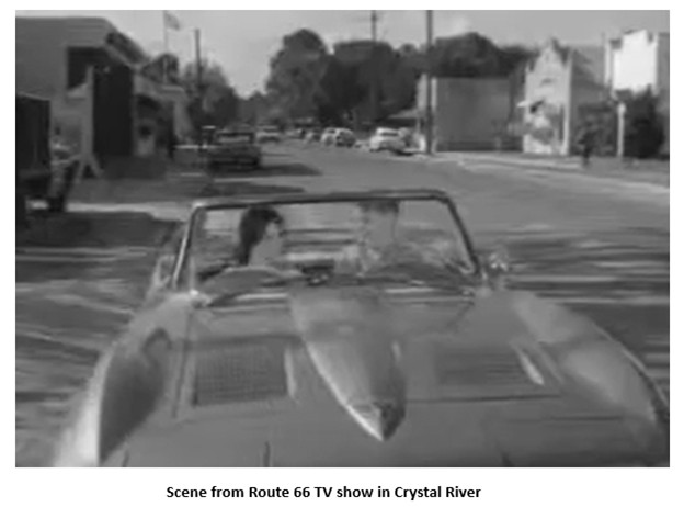 During the third season, the “Route 66” crew and stars came to Florida to film some episodes in the series. The producer decided that the Crystal River and Weeki Wachee areas would be perfect setting for one of the chapters. The caravan of equipment and staff rolled into Crystal River on March 10, 1963 and filming started the next week. Crystal River storefronts on Main Street were used as the “props” for some scenes. Crystal River residents Doris Morgan and Fay Duffy were tapped as stand-ins for the stars during some scenes. Other Crystal River folk were used as background extras. The Wander Inn restaurant was used for both interior and external shots. [The restaurant burned down a few years later]
