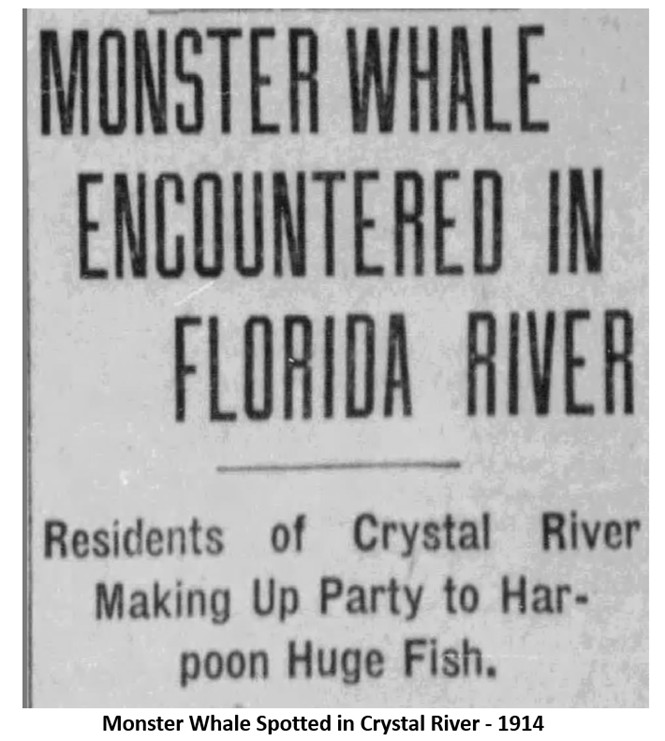 In the summer of 1914, J.W. Gilley and a party of three other fishermen were in a boat near Miller’s Point in Crystal River. Suddenly a huge fin broke the surface and created a wave that nearly capsized their boat. Nearby anglers reported seeing the same huge splash in the water. Mr. Gilley managed to peer into the water and saw a whale that he estimated was between 45 and 50 feet long. He had some previous experience with whales and declared that it was a grumpus whale. News spread throughout the town and a party of men launched boats into the bay to attempt harpooning the creature. There were no further whale sightings that year so the visitor must have escaped his fate.
