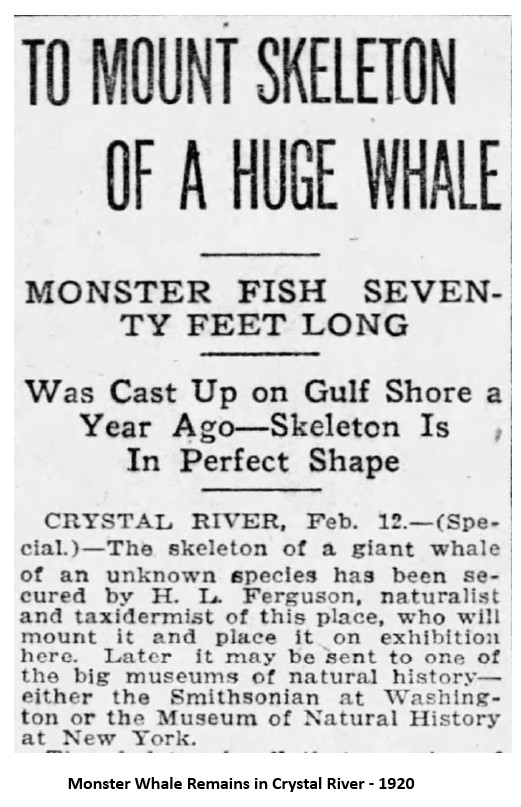 A more credible sighting occurred in 1920-1921. A huge whale, reportedly about 70 feet long, washed up on the shore in Crystal River. . There had been other whale remains cast upon Citrus County shores but had either drifted back to sea or disintegrated before an in-depth examination could be conducted. A group of local businessmen led by Frederick Van Roy engaged noted naturalist H.L. Ferguson to determine the length and species of the mystery whale.