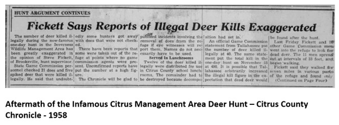 After a 20-year recovery period, sportsmen and hunting groups petitioned the government to open the management areas to controlled harvesting of the deer. The Fish and Wildlife staff relented in 1958 and announced the opening of the Citrus Management Area land to hunters. Over eager 3,200 hunters joined the hunt on the first day. Officials planned to stop the hunt once the limit of 250 deer was reached.