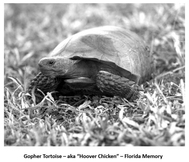 Deer were not the only wild resource that kept people alive during the Great Depression. Many people blamed President Herbert Hoover for the financial chaos. They found a natural meat source that was plentiful and tasted like chicken. Today we know them as “Gopher Tortoises”. During the Depression, residents collected the slow-moving reptiles and served as the main course for their meals.